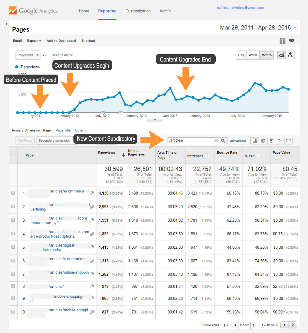 One of the keys for content marketing (versus continually paid traffic sources like pay per click or content/display advertising) is the potential for long-term ROI. This campaign consisting of 67 article placements over a period of 9 months, has continued to return increasing traffic levels for a period of 36 months. The program has produced an average of 395 new visitors per page.