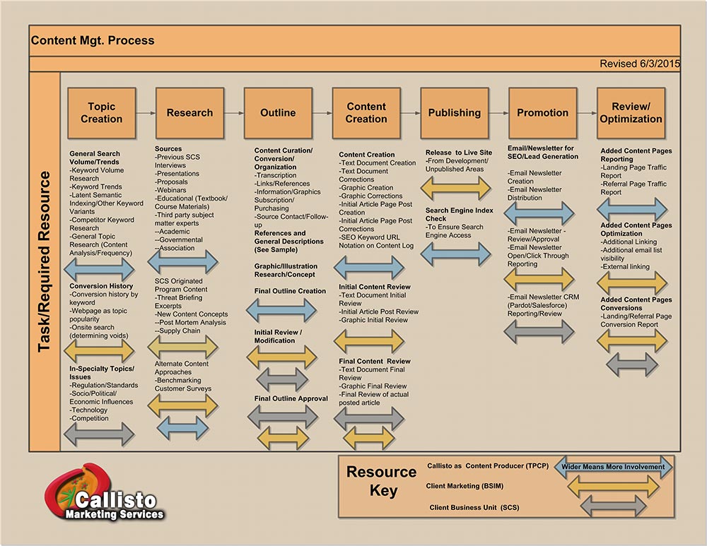 While we have programs that we repeatedly use (mainly because they work), we can tailor these to many situations. For example, the above is a method of managing the content process for a large organization that wanted to balance the workload between us, their marketing department and their business unit. Almost all of these programs can scale up or down, be tuned for various levels of oversight and approvals and be deployed on a staged basis to prove efficacy.