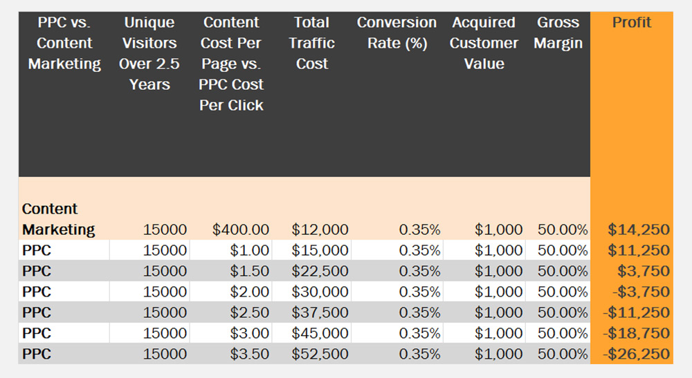 No matter who pays for the content creation, it has to be profitable. The above scenario compares an ongoing pay per click traffic acquisition approach to single placement content marketing (Basically, fee-based paying per article). Clearly, paying once for the content and having it return over time is the higher ROI scenario. But even in that case, the value (revenue, profit, etc.) from each customer has to be high enough to justify the acquisition cost.