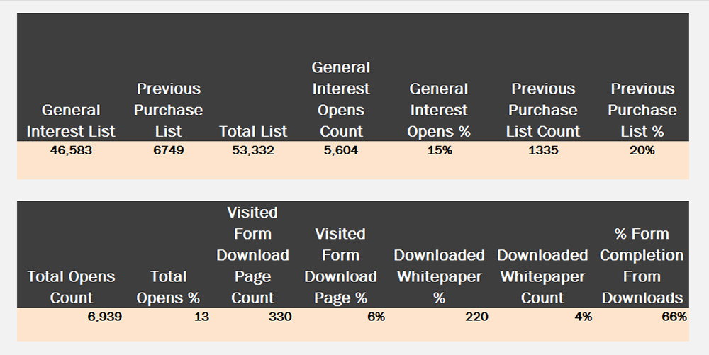 The number of those who clicked through to the download form from the combined list was 6% (or about 330) and those who actually downloaded the white paper were 220, or about 66% of those who visited the download page. This resulted in an overall 3.0% (Three percent) conversion rate of “visitors” to lead.